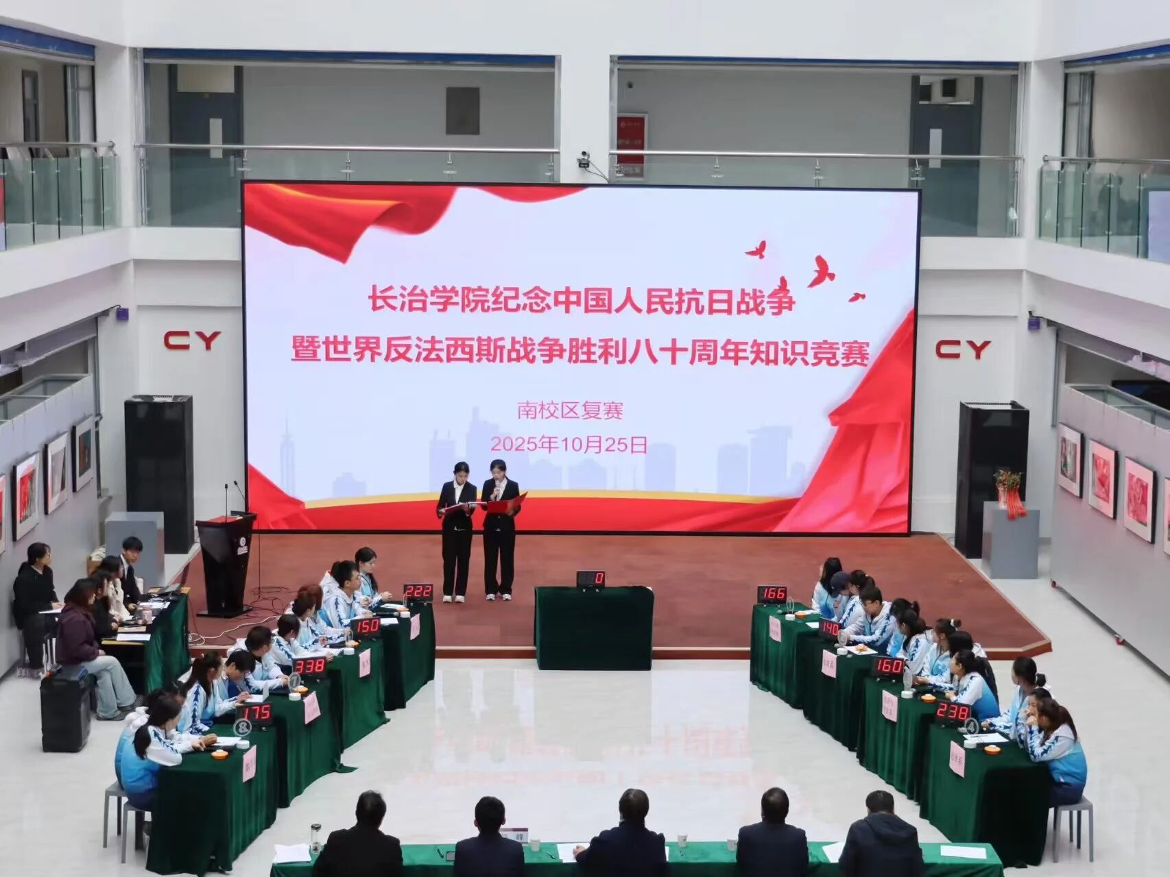 为深入学习贯彻习近平新时代中国特色社会主义思想,引导广大青年学生从党的百年奋斗历程中汲取智慧和力量,坚定理想信念,2025年10月25日,长治学院第三届党史知识竞赛复赛在南校区三号教学楼学术报告厅顺利举行,此次活动由党委宣传部、学生工作部、校团委联合主办,马克思主义学院承办。学生工作部部长韩峰、校团委书记郝炯、马克思主义学院党委书记赵晋耀出席此次活动。