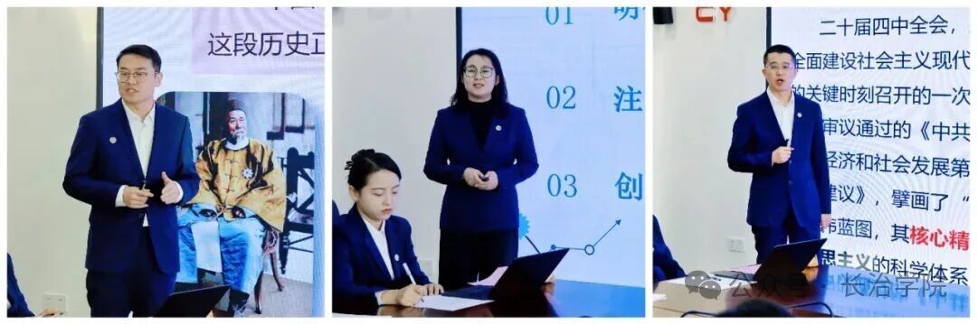 宣讲结束后,与会人员围绕学习内容进行了深入交流,聚焦“为什么融、融什么、如何融”,就如何将党的二十届四中全会精神融入思政课进行了集体备课研讨。《习近平新时代中国特色社会主义思想概论》课程组负责人程雅娟就融入情况进行了教学展示。其他思政课课程组负责人文永刚、马晨曦、李少伟、蒋承伟,分别结合各自课程情况,就融入思路、教学方法、案例建设等进行了专题汇报。