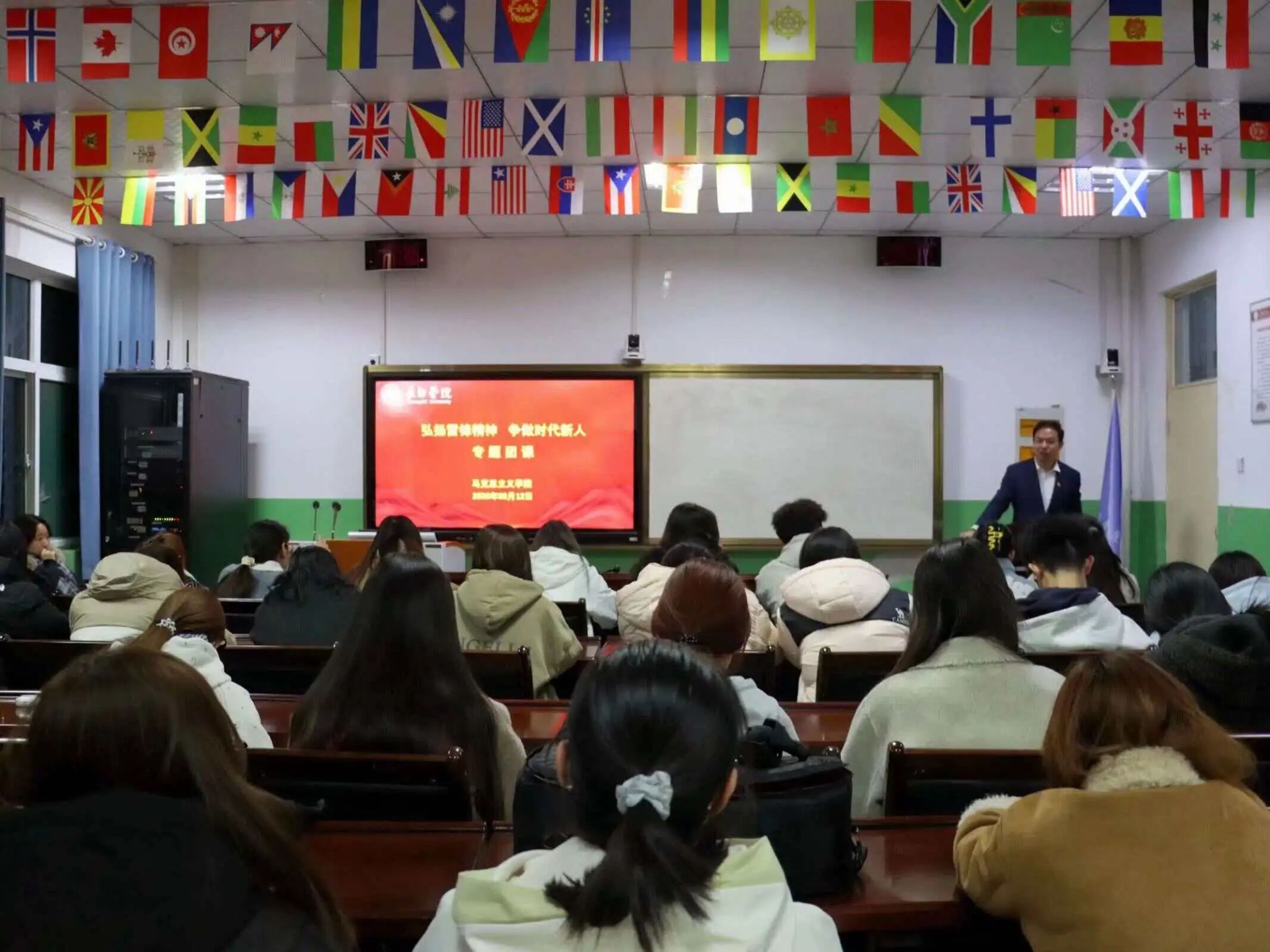 随后,李振国副书记以“弘扬雷锋精神争做时代新人”为主题,为全体与会人员讲授了一堂生动的团课。他从雷锋精神的时代内涵、雷锋精神与青年成长的内在联系、新时代青年如何践行雷锋精神三个方面进行了深入阐述。他指出,雷锋精神的核心是奉献、服务、责任与担当,这与新时代青年的使命要求高度契合。作为马克思主义学院的学生骨干,更要深刻理解雷锋精神的时代价值,将其内化于心、外化于行,在学习上刻苦钻研,在工作中勇于担当,在生活中乐于助人,努力成长为有理想、敢担当、能吃苦、肯奋斗的新时代好青年。