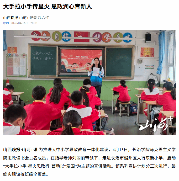 近日,《山西晚报》对长治学院马克思主义学院习近平新时代中国特色社会主义思想读书会走进太行东街小学开展的“大手拉小手・星火思政行”爱国主义主题宣讲活动进行专题报道,聚焦我校大中小学思政教育一体化建设的创新实践,展现校地协同育人的良好成效。