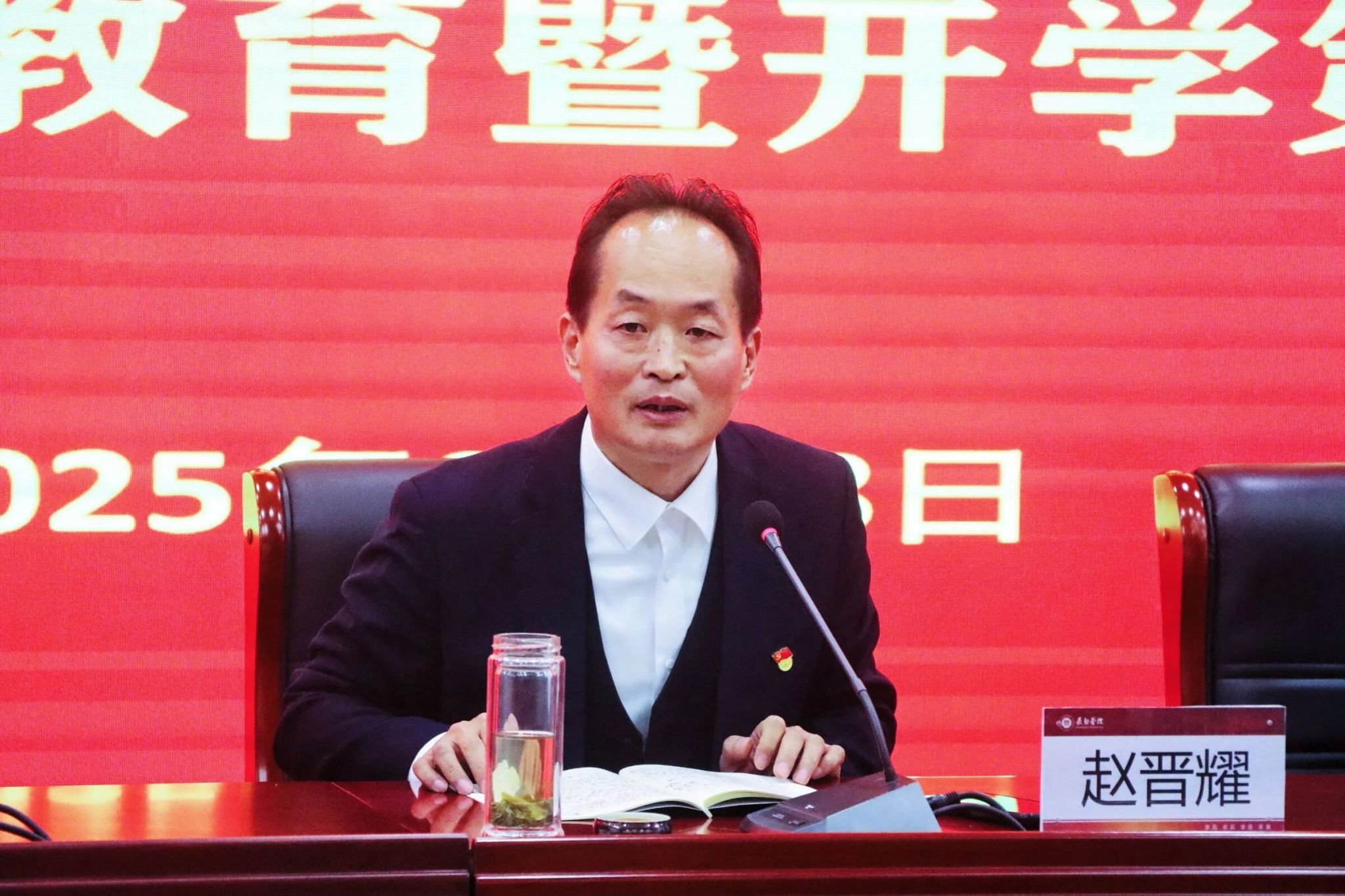 会上,赵晋耀老师以 “大学的本质” 为核心,为新生讲授开学第一课。他指出,大学的核心使命是系统培养学生的理性思维能力,引导学生透过现象看清事物本质。他进一步阐释,上大学的意义在于追求更高层次的认知提升,培养学生对社会的适应能力与面对生活的韧性,因此无论未来身处何种岗位、遭遇何种境遇,希望学生能主动克服懈怠心理与畏难情绪,以积极心态主动参与各项学习与实践,不断锤炼自我、实现蜕变。他特别强调,大学不仅是知识的殿堂,更是塑造人格、培养责任感的关键时期,希望每一位新生都能以主人翁的姿态融入集体,在互助与共进中收获成长。